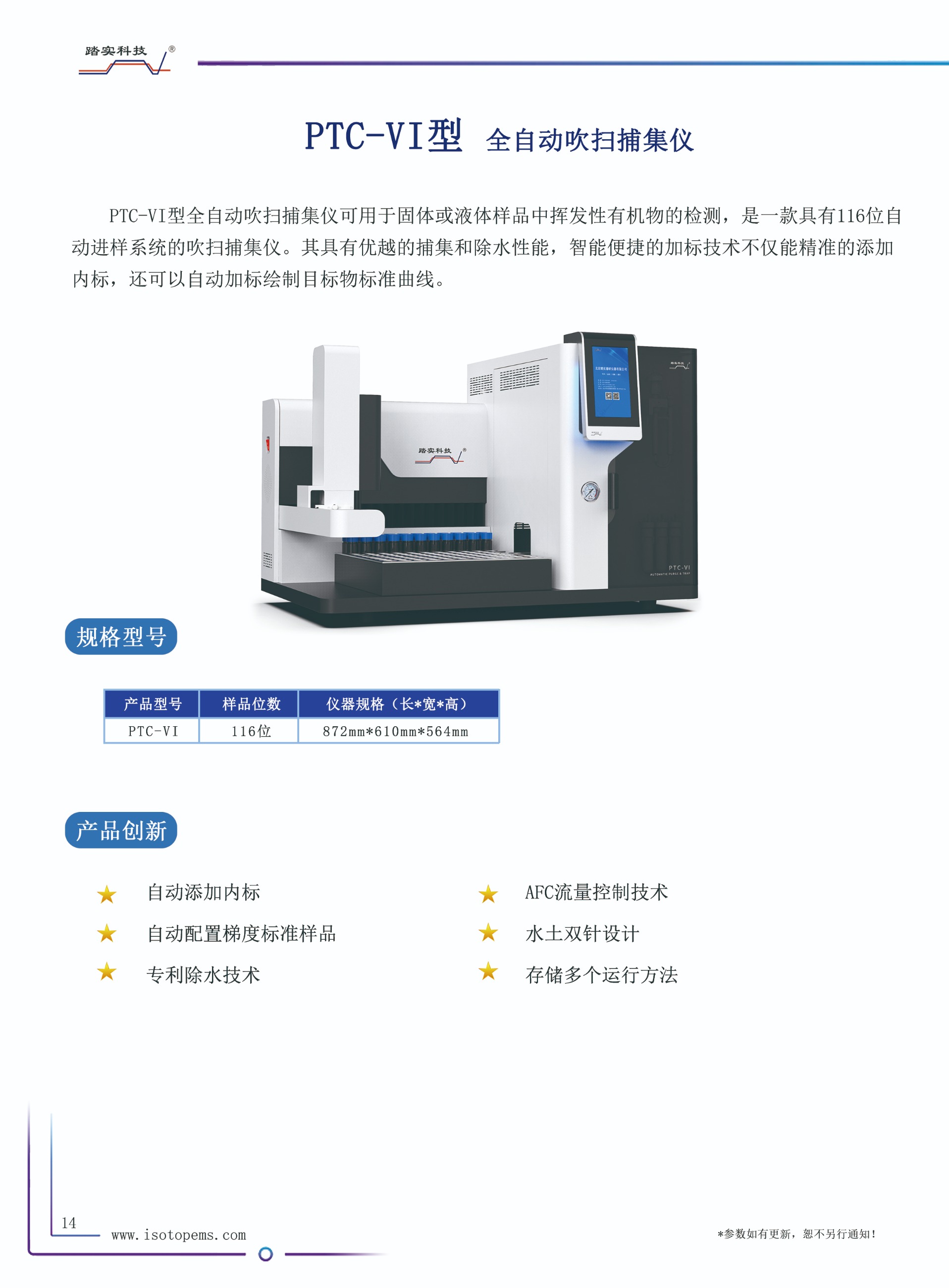 PTC-VI型全自動吹掃捕集儀可用于固體或液體樣品中揮發性有機物的檢測,是一款具有116位自動進樣系統的吹掃捕集儀。其具有優越的捕集和除水性能,智能便捷的加標技術不僅能精準的添加內標,還可以自動加標繪制目標物標準曲線。通過與GC或GC-MS的聯用,可以廣泛應用于環境分析,如飲用水、廢水、土壤中的有機污染物分析,也可用于食品中揮發物(如氣味成分)的分析等。該款儀器符合《HJ639-2012水質 揮發性有機物的測定 吹掃捕集/氣相色譜-質譜法》、《HJ686-2014水質 揮發性有機物的測定 吹掃捕集/氣相色譜-質譜法》、《HJ605-2011土壤和沉積物揮發性有機物的測定 吹掃捕集/氣相色譜-質譜法》等標準。